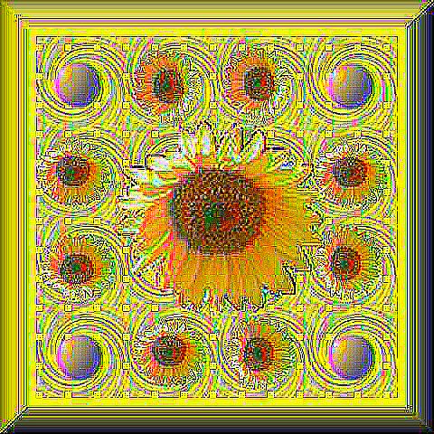 A yellow creation made in 5 layers, border added and buttonised twice, and below - Effects/Edge effects/Enhance/Enhance more.